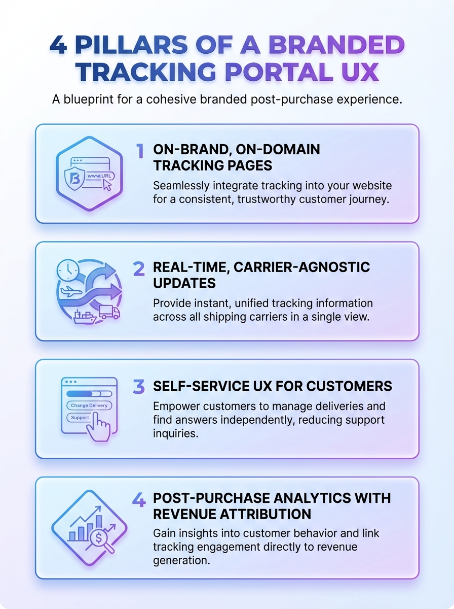 This infographic visualizes the four pillars of a branded tracking portal UX to guide cohesive design decisions.