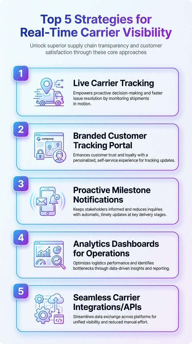 A concise breakdown of the five key strategies to enable real-time carrier visibility. Learn how live tracking, data integration, alerts, analytics, and dashboards boost logistics responsiveness.